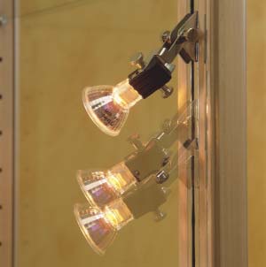 Grundausstattung mit 5 höhen-verstellbaren Regalen und 10 St. 20 W stufenlos verstellbaren Magnet-Halogenleuchten (ausbaubar bis 12 Leuchten) inkl. Türschloß und Kristalltürgriffen.
